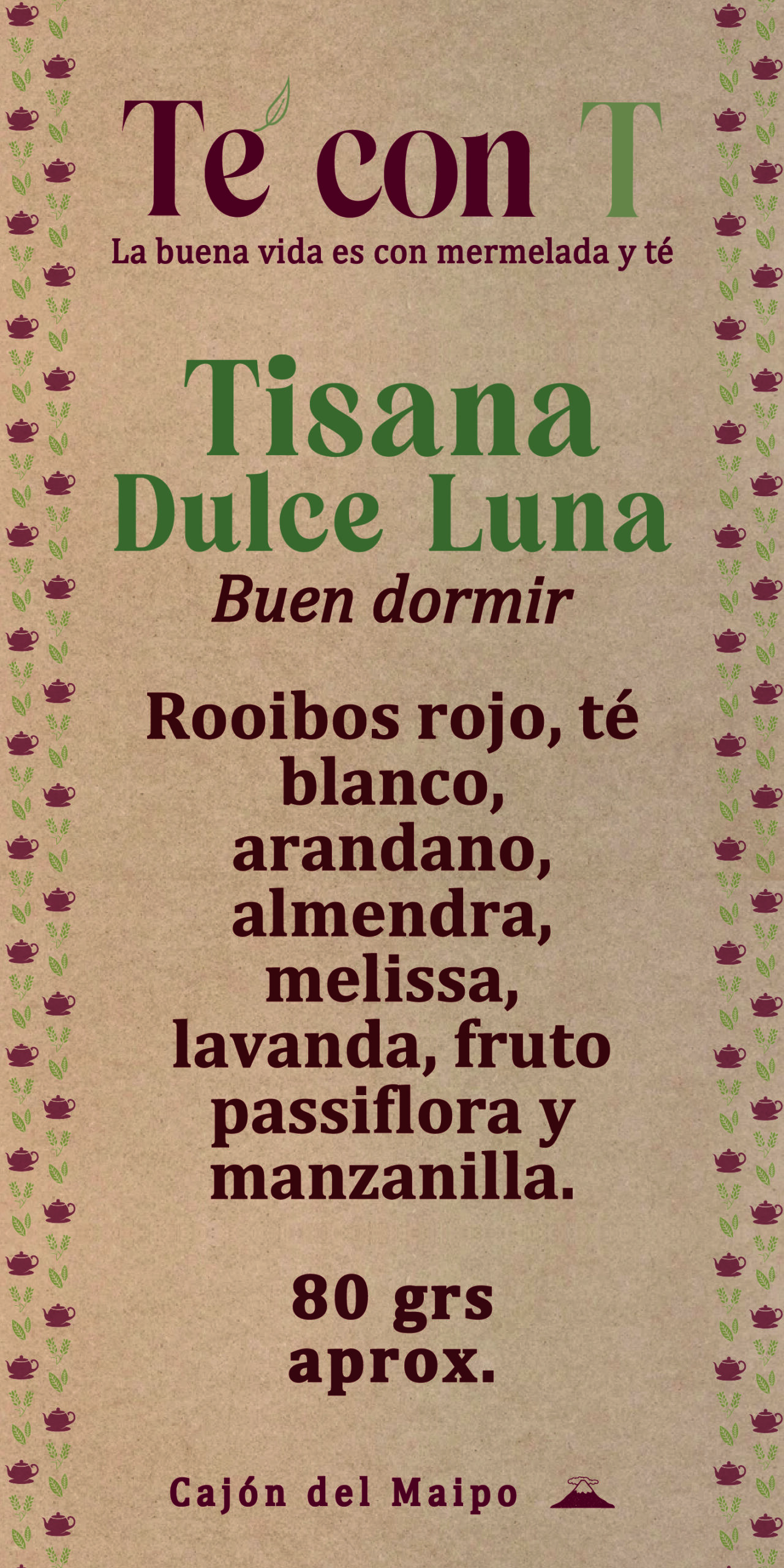 • Rooibos rojo, té blanco, almendra, arándano, ciruela, melissa, lavanda, hierbabuena y fruto de passiflora.